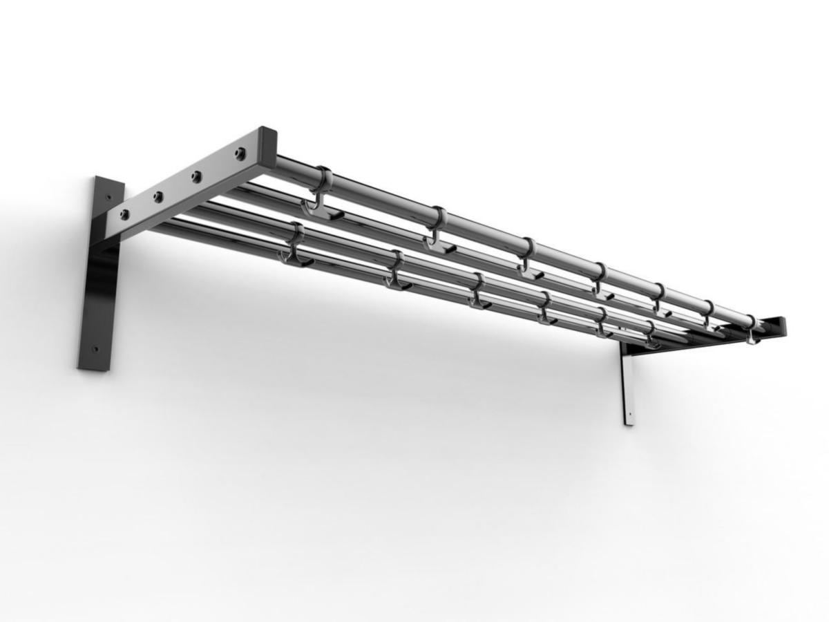 Svensktillverkad kapprumsinredning i kvalitetsstål. Passar i offentlig miljö, kontor och bostäder. Kan beställas i förnicklat och även pulverlackerad i valfri färg. Mått helt enligt önskemål. Förberedd för fast montering på vägg med 10 stycken ankarkrokar per meter. Ställkostnad tillkommer vid annan valfri RAL färg.