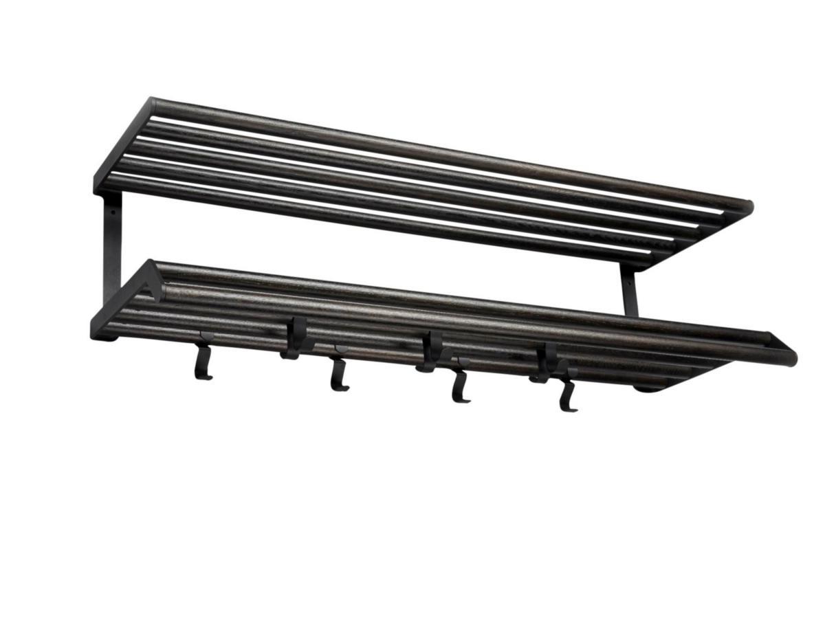 Hatthylla Essem Tamburin, hyllan har pulverlackerad stålgavlar och krokar i kombination med runda ekstavar i klarlack eller svartbets.