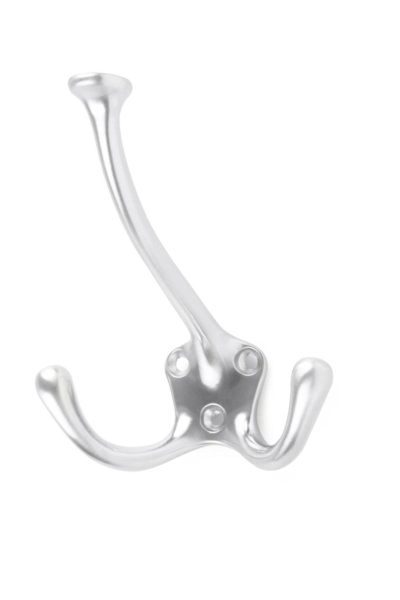 Krok av zamak i förnicklat, borstat stål, vitt och svart. Kroken har hög förvaringskapacitet med sina tre krokar.