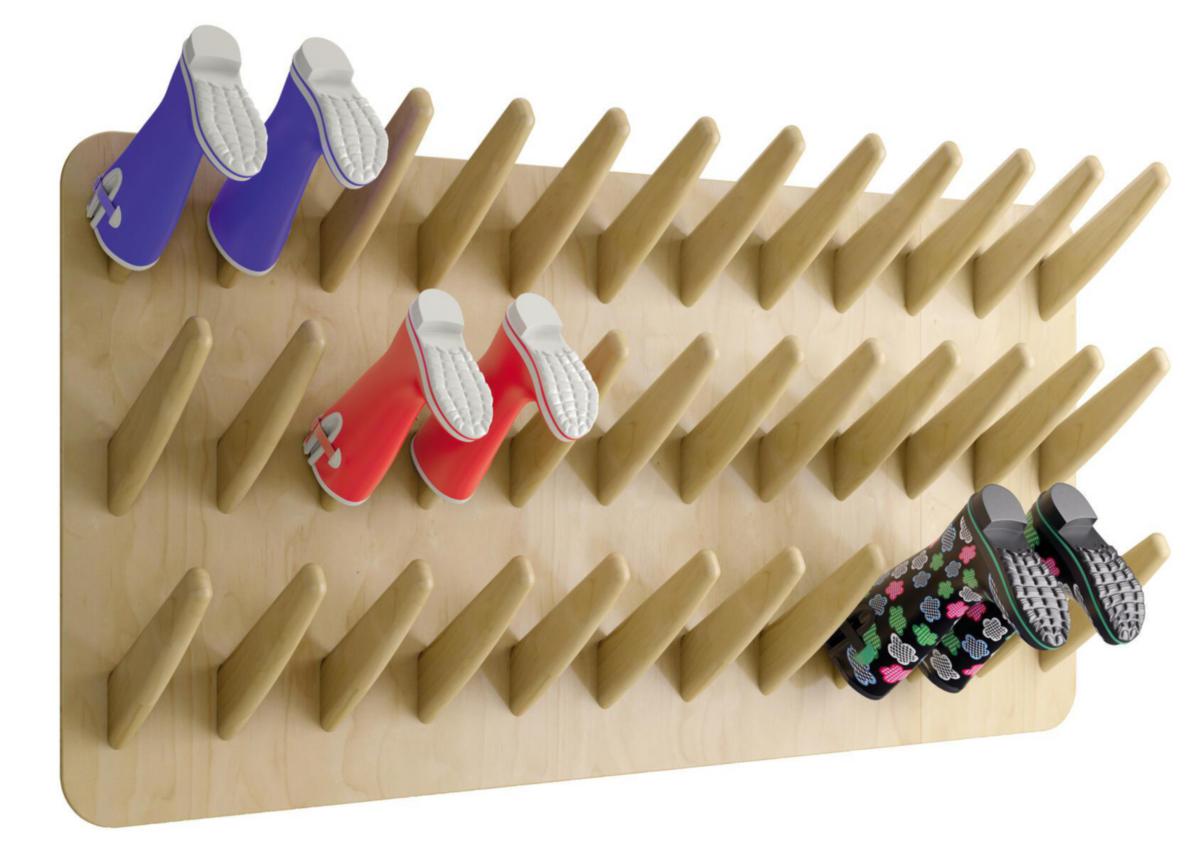 Stövelvägg med plats för 18 par stövlar. Längd på pinne 20 cm. Platta av plywood och pinnar av trä.