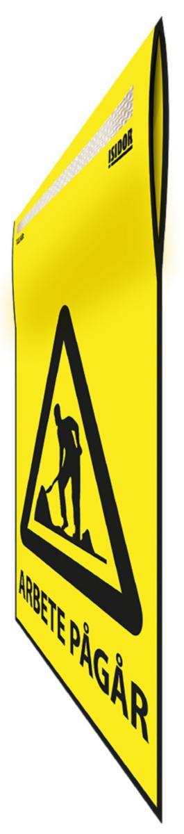 Lös flagga, "Arbete pågår". Flaggan har en ögla upptill som gör att den lätt går att trä på en vanlig planka eller annan typ av avspärrning.