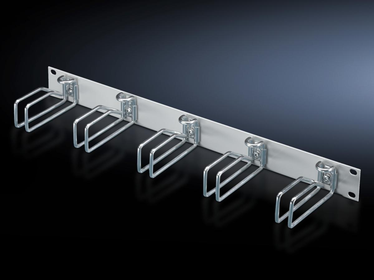 Rangerpanel, med stålbyglar, Färg: RAL|9005, Beskrivning: För horisontell rangering av kontaktdonskabeln med 5 kabelföringsöglor.