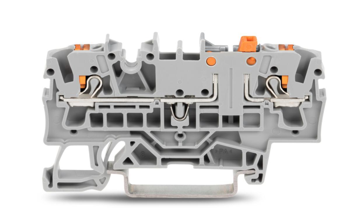 Frånskiljbar kopplingsplint / Testplint med tryckknapp samt testmöjlighet och orange frånskiljbar länk.För DIN-skena 35. 2x 2,5/4 mm². Push-in CAGE CLAMP GRÅ