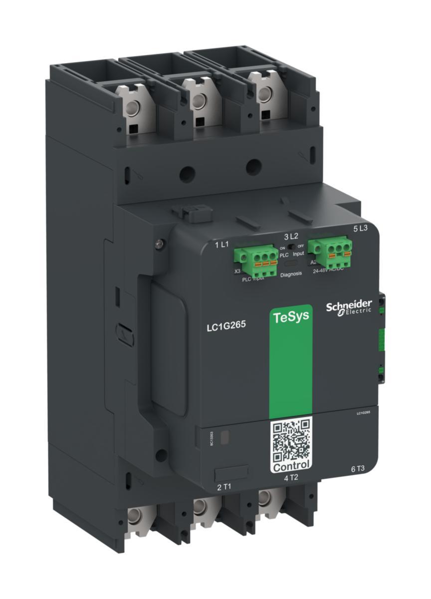 TeSys Giga kontaktor, 3 huvudpoler (3 slutande) för kategori AC-3 applikationer upp till 265A 160kW@440V. Denna har multispänning 24-48V AC/DC lågförbrukande elektronisk spole, PLC-utgångskontroll med hög tillförlitlighet 1 slutande (NO) + 1 brytande (NC) hjälpkontakt (17V 1mA). Designad för krävande applikationer med maximalt antal manövercykler upp till 600 per timme och i miljöer upp till 60°C. Det ger hög tillförlitlighet och hållbarhet med mekanisk hållbarhet på 5 M cykler. Lokal eller fjärrkontakt för diagnostisering av slitage (CWD) som standard med kontinuerlig övervakning med status- och larmindikering. Det är möjligt att byta kopplingsmodul (huvudpol), för förbättrad livslängd. Mekaniskt underhåll utan att ta bort kablar/samlingsskenor, och överlastrelä kan monteras direkt under kontaktorn. Tack vare strömanslutning genom bult förbindelse med jackbar anslutning och manöveranslutningar med fjäderterminaler, tillgänglig från framsidan för enkel och snabbt byte. Det ger IP2x -skydd i framsidan med skydd enligt med IEC 60529 and VDE 0106. De klarar från -25°C med 60°C driftstemperatur och monteras direkt monterad på montageplåten, klarar upp till 3000m höjd utan omräkning. Storleken är 255mm x 108mm x 175mm (H x B x D), kompakt storlek sparar plats på panelen. Multi standard certifikat (CE,CB,CCC,cULus,EAC,KC,RCM,Marine) och Green Premium -kompatibel (RoHs/Reach). Unik QR -kod ger snabb åtkomst till komplett produktdata.