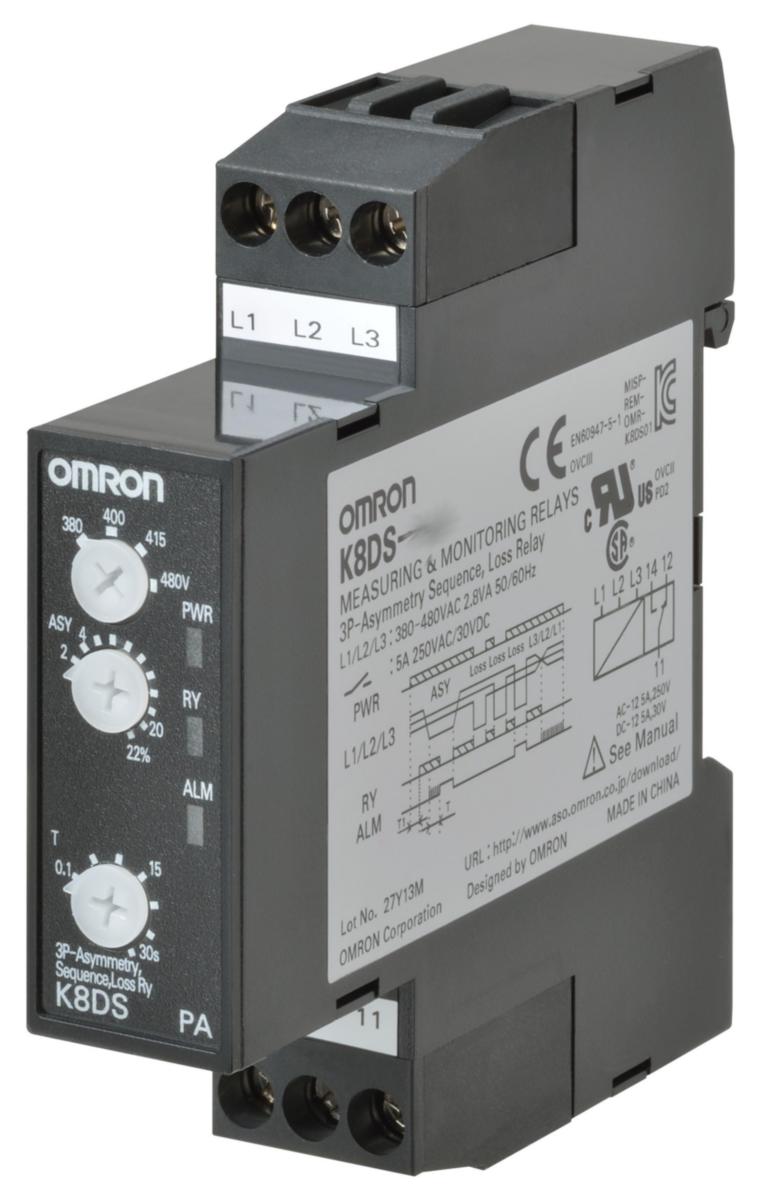 Övervakningsrelä 17,5mm, för 3-fas spänningsassymmetri-, fasföljd-, fasförlust. K8DS-PA övervakar spänningsasymmetri, fasföljd och fasförlust i 3-trådiga 3-fasnät. Stöd för alla värdens vanliga standardspänningar i samma produkt.