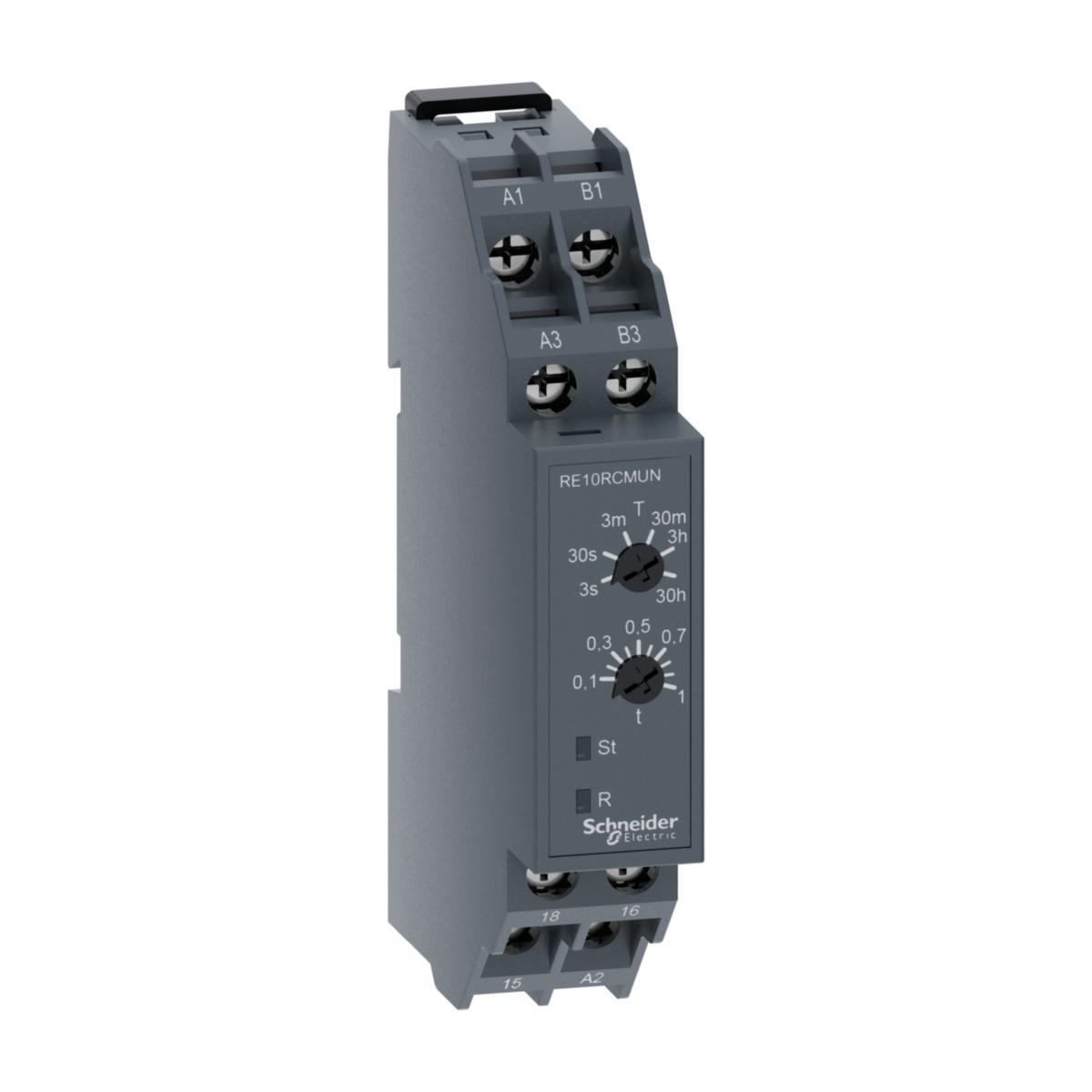 Det här modulära tidreläet ingår i Schneider Electrics sortiment av Easy Harmony Timer-reläer. Detta är en 5A, 24Vac/dc eller 240Vac matning, 1 CO, timerrelä för montering på din-skena och OFF-fördröjning med styrsignal 'C' tidsfunktion. Detta timerrelä kan ställas in mellan 0.1 sekunder och 30 timmars OFF fördröjningstiming med styrsignal. Den har 1 växlande (CO) 5A kontakt, i SPDT (enpolig dubbel kast) konfiguration. Den har en enda OFF-fördröjningstidsfunktion i 17,5 mm formfaktorer, vilket möjliggör en flexibel och enkel installation på DIN-skena. Denna produkt levereras med enkel vridrattsinställning för avsedd tidskontroll. Dess mått är 17,5 mm (bredd) x 58,5 mm (höjd) x 90 mm (djup) och väger 0,075 kg. Dess design är lämplig för industrimaskiner, HVAC-kompressor, pumpfläktstyrningsmaskiner, automationskontrollpaneler, låg-/mellanspänningsställverk, motorstyrningar. Den är också lämplig för fastighetsautomation, eldistribution av paneler och belysningsstyrning. Den överensstämmer med internationell standard, certifieringar och märkningar cULus, CE, CCC och UKCA.