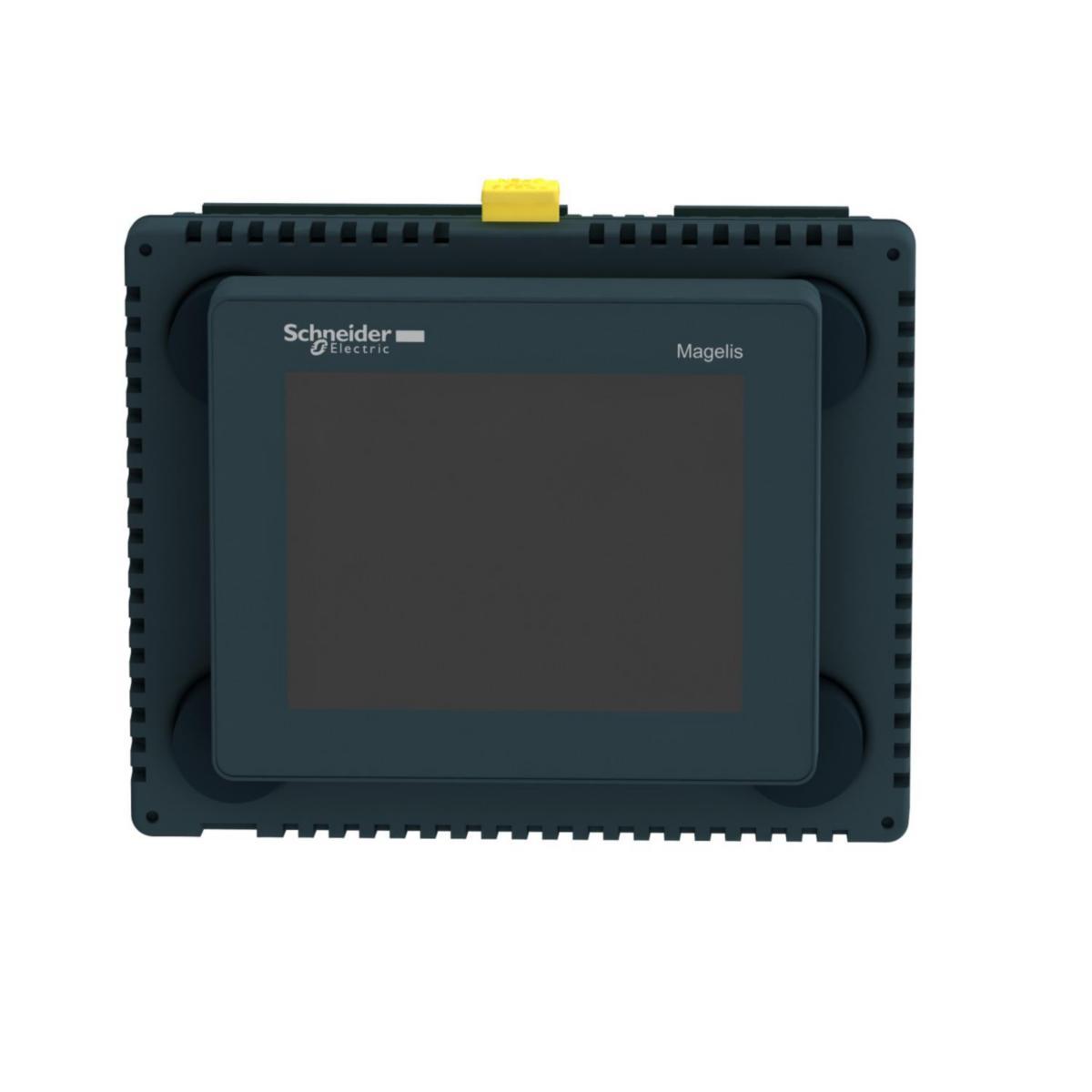 Denna Magelis SCU-styrenhet med liten pekskärm för operatörsgränssnitt (HMI) matas med 24 V DC, har en 3,5-tums TFT LCD-färgskärm och 128 MB EPROM. Den har också 16 digitala ingångar, 10 digitala utgångar, 1 värd + 1 mini-B USB-port, 1 RS232C/RS485-port och 1 CANopen-port. Den är idealisk för optimerad information och kommunikation med automationssystem inom industri och infrastruktur, t.ex. kompakta maskiner, hanteringssystem, maskiner för livsmedel och drycker samt läkemedelsindustrin. Skärmen visar textmeddelanden, grafiska objekt och mimiska diagram, kontroll och konfiguration av data. Dess RS485- och CANopen-värdportar gör den idealisk för att övervaka och styra enkla system och maskiner. Dess flera I/O, inklusive höghastighetsräknare, gör att du kan hantera processer snabbt och effektivt.