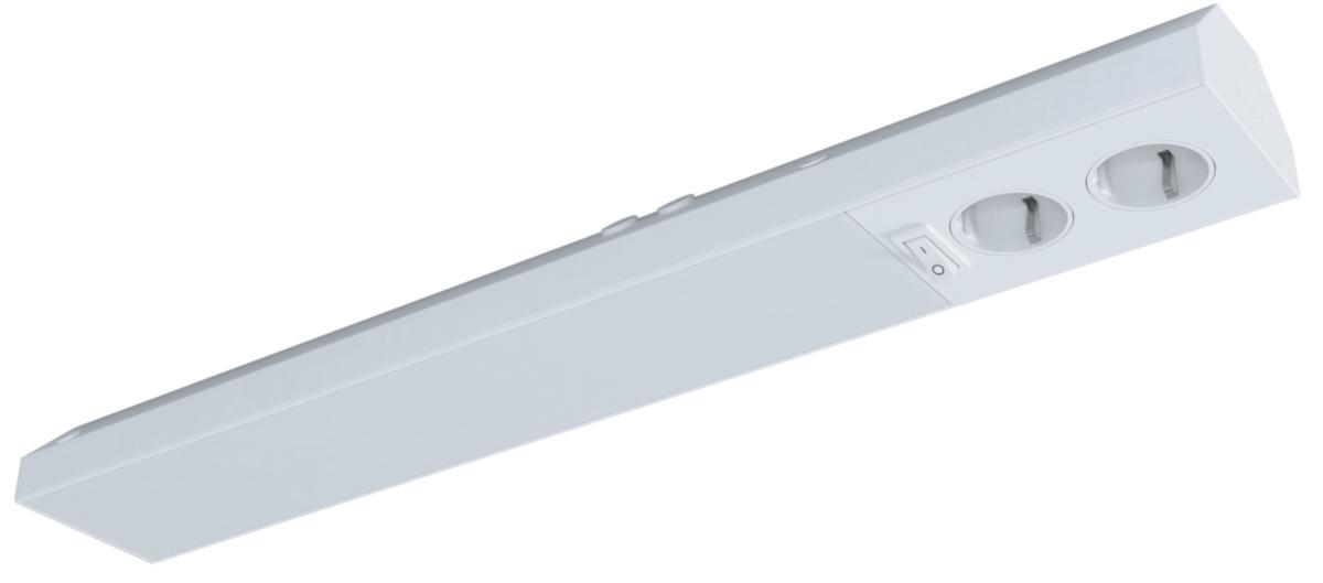Bänkarmatur med dubbla uttag och dimbar med fram- bakkantdimmer. Tillverkad i extruderad aluminium med opalt bländskydd. Armaturen har dubbla kabelingångar i centrum av armaturen på undersidan och bägge långsidoorna. Vippströmställare på framsidan för styrning av belysningens. Armaturen fästs med medföljande skruv mot tak eller vägg. Uttagen fungerar oavsett om armaturen är tänd eller inte. Lämplig för översskåpsbelysning i kök, tvättstugor etc
