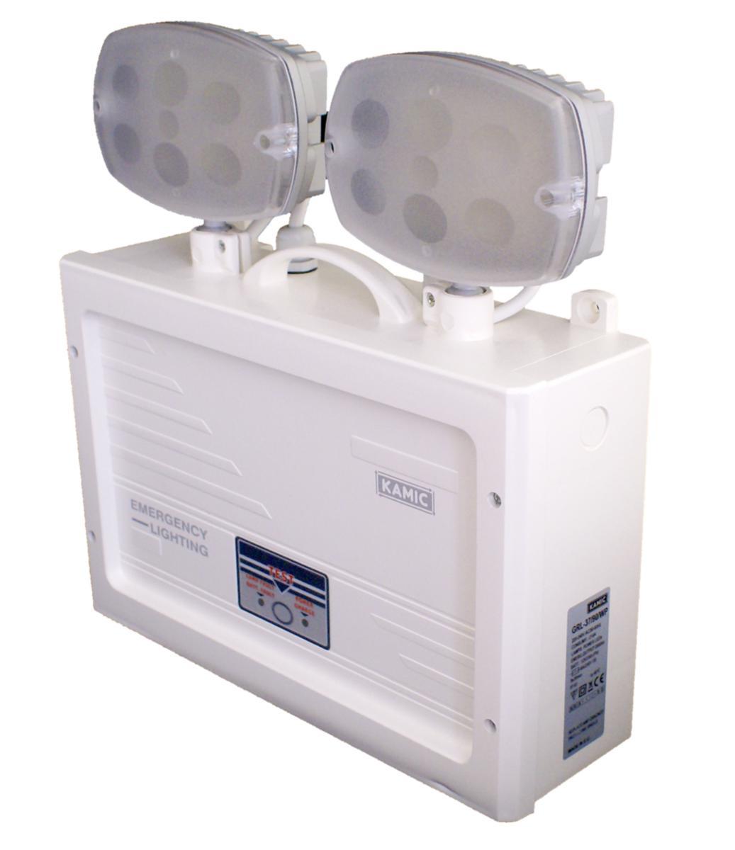 Robust strålkastaraggregat med Power LED:s och hög kapslingsklass (IP65) avsett för beredskapsdrift i utrymmen som kräver ett kraftfullt ljusutbyte. Stomme i vit polykarbonat med 2 st strålkastare i aluminium/transparent polykarbonat. Strålkastaraggregatet har inbyggd nödströmsautomatik med batteri och autotest. Testknapp finns även på fronten för manuellt test. Aggregatet ansluts till nätspänning 230V AC 50-60 Hz för nödströmsövervakning och underhållsladdning. Ljusflöde: 2 x 1000 lm. .