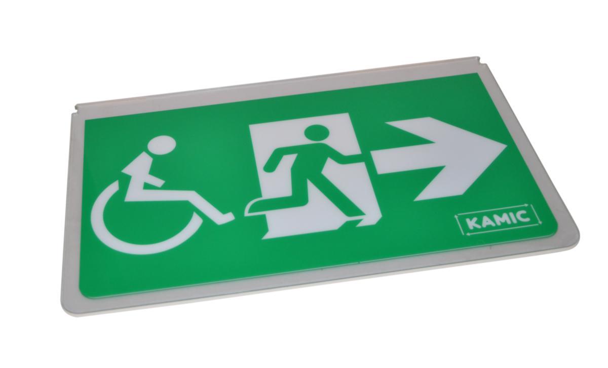 Underhängande dubbelsidig skylt med rullstolsymbol, hänvisning pil höger/vänster. Läsavstånd 30 meter. Piktogram skylten passar till nödbelysningsarmatur TOOPac (e-nr: 7345497, 7347751).