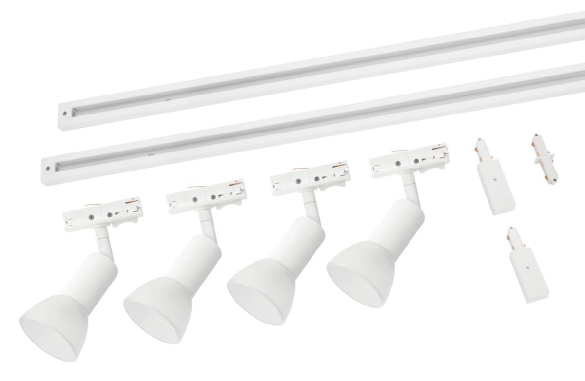 DUOline set VETRO COB med 4st vita armaturer med frostad glaskupa på vardera 5 W LED inbyggd ljuskälla, 430lm, 3000K, optik 30 grader samt dimbara. Inklusive 2x1m skena koplett med anslutningsdon, täcklock, ändlock och skarv. Passar endast DUOline skenan.