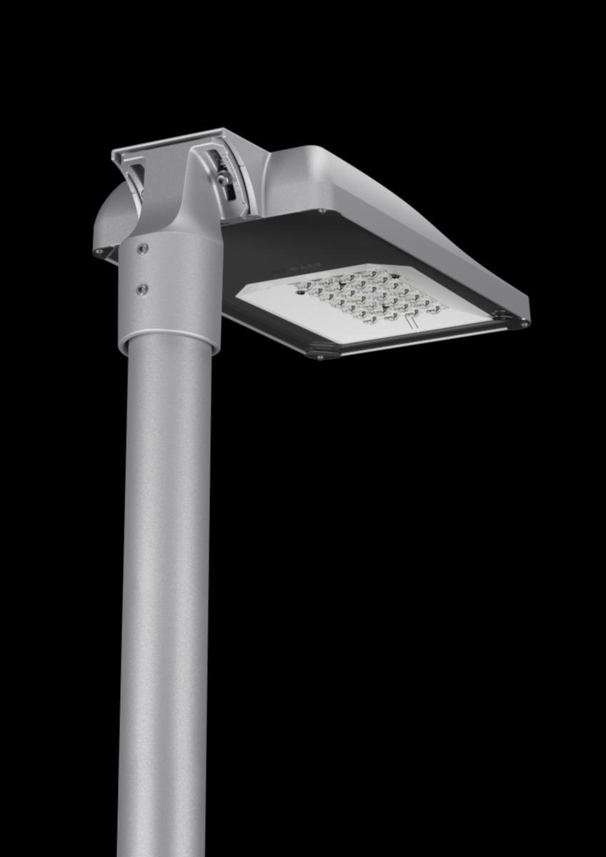 För 60/48/42 mm stolptopp eller stolparm. Armaturhus av pressgjuten aluminium, Siteco metallicgrå DB702S. Klass II. Förprogrammerad nattsäkning, -3h - +5 till 50%. Inklusive 10,5m gummikabel