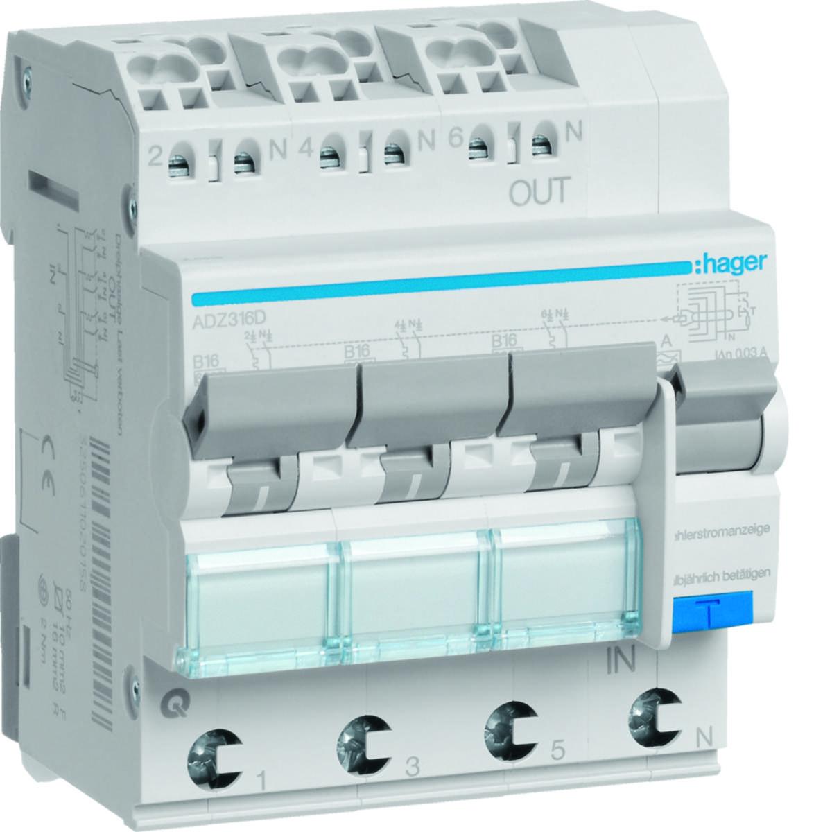 Personskyddsbrytare 3 x 1- polig + N med snabbanslutning QuickConnect ADZ316D (E-nr:2163823) även kallad personskyddsautomat är en kombination av jordfelsbrytare och minibrytare som förhindrar och skyddar mot tex överström, överhettning/brand och elektriska fel som kan leda till personskador. Personskyddsbrytaren är på 16A med B-karakterisk och har en brytförmåga på 6kA samt en felström på 30mA. Produkten är tre 1-poliga minibrytare för tre 230 V strömkretsar med en jordfelsbrytare.