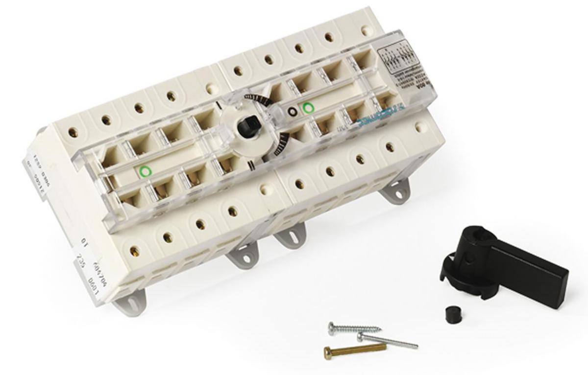 Omkopplare 1-0-2 för DIN-slits med synligt brytställe. Anslutningsarea: Cu 50 mm²