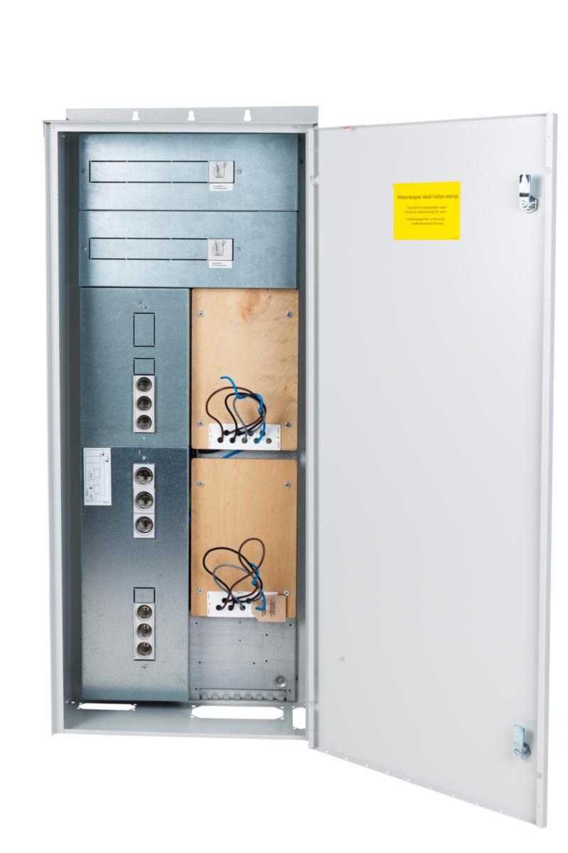 Mätarskåpen är anpassade till nya krav från elleverantörer och användare. Utförandet är anpassat för fjärravläsning av elmätare och för nya funktioner inom kommunikation. Detta innebär bland annat att huvudbrytaren är placerad efter mätaren, för att elleverantören skall ha kontakt med mätaren även när brytaren är frånslagen. Kommunikationsdelen är utökad med en så kallad medielåda som täcker de flesta system som t. ex. tele, data, TV, larm mm. De flesta modeller har modulplats för installation av nätägaren, överspänningsskydd samt modulplats i utgående del för installation av t. ex. abonnentens överspänningsskydd, belastningsvakt, jordfelsbrytare eller utgående säkringsgrupper, etc. Medielåda och potentialutjämningsskena ingår ej men finns som tillbehör. Inkommande plint för Cu35 alt. Al50. Flänsöppningar: 2 st FL13 samt 1 st FL21 för Media/Tele anslutningar. Vid flera utgående huvudledningar byts utgående plint mot t. ex. EKS525. 14 modulplatser finns för externa apparater.