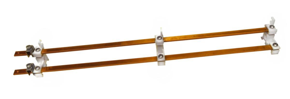 PE-N utrustning bestående av 2st CU-skenor 10×2,5mm med fäste för DIN-skena, för komplettering med bygelklämmor DRK.