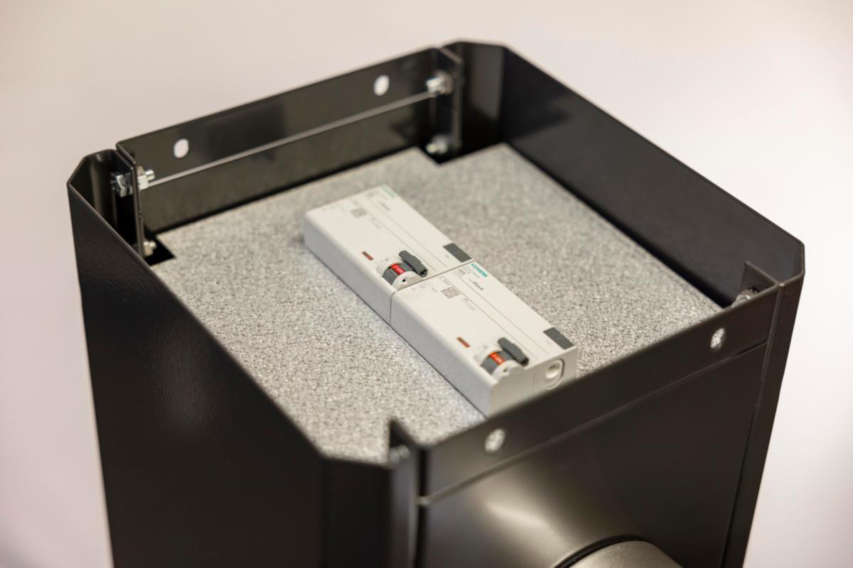 Polebox har en monterad fördelningsplint för upp till 2 x 5G25 mm2 elkabel för vidare koppling till nästa laddstolpe . Från fördelningsplinten i Polebox ansluts sedan respektive laddbox med gummikabel. Polebox levereras med DIN-skena för två RCCB/RCBO. Allt ryms i lådan.