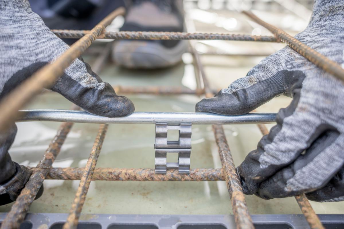 DEHNclip för säker, snabb, enkel och verktygslös anslutning av rundledare 10mmØ mot armeringen 10mmØ. Blixtströmstestad enligt SS EN 62561-1.