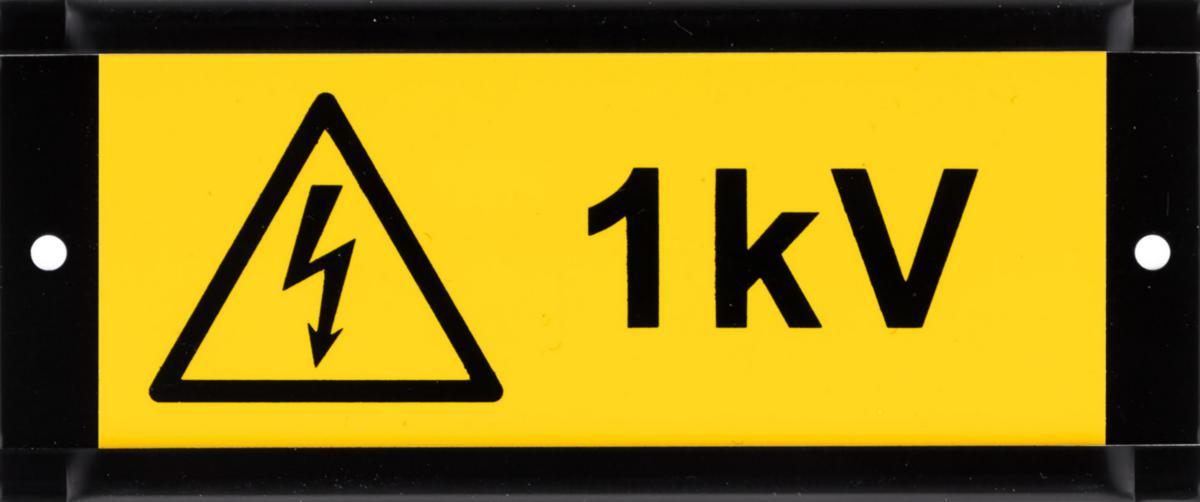 Gul med svart text. Monterad i svart bottenplatta i alum, med hål för montage. Märks upp på anläggningar med kV sytem. Screentryckt samt skyddslackad med klarlack för bästa kvalité i varierande miljöer.