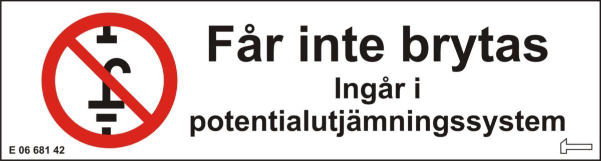 Skylt med symbol och text: FÅR EJ BRYTAS Ingår i potentialutjämningssystem. Vit/svart/röd 0,7 mm aluminium med hål för montage. Sätts upp där det föreligger risk att potentialutjämningssystem kan brytas. Screentryckt samt skyddslackad med klarlack.