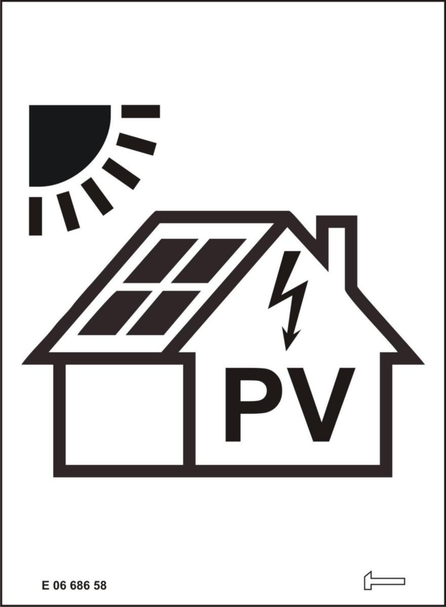 Vit med svart text, självhäftande. Varning- och informationsdekal för solcellsanläggningar. PV-system / Photovoltaic system. Symbol enligt "Solceller Handbok 457 Utgåva 1".