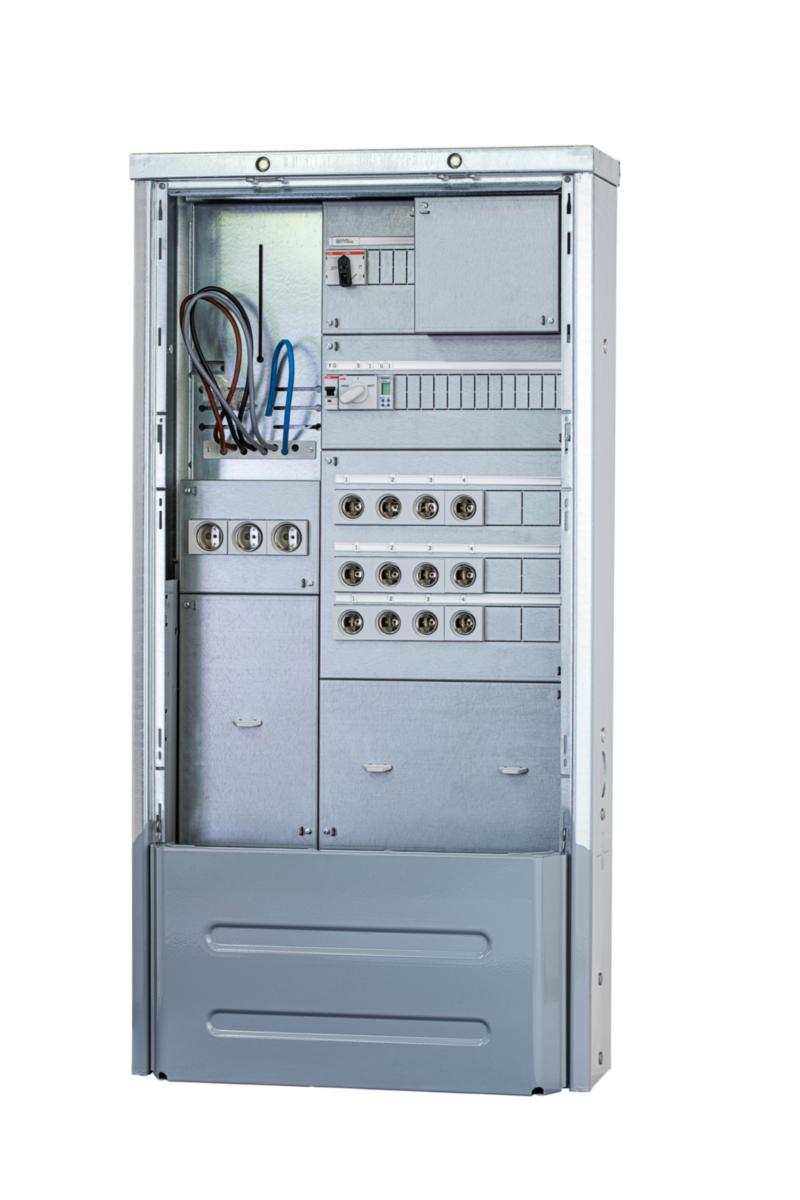 Ledig plats på DIN-skena, 4+13 moduler, för montering av överspänningsskydd eller kommunikationsmodul. Serviskabeln ansluts på plint för kabel med max ledararea 50 mm² Al/Cu. Utgående kabel ansluts på plint för max 16 mm² Al/Cu. Kapslingen är Cewe NC-kapsling. Integrerat markfundament.
