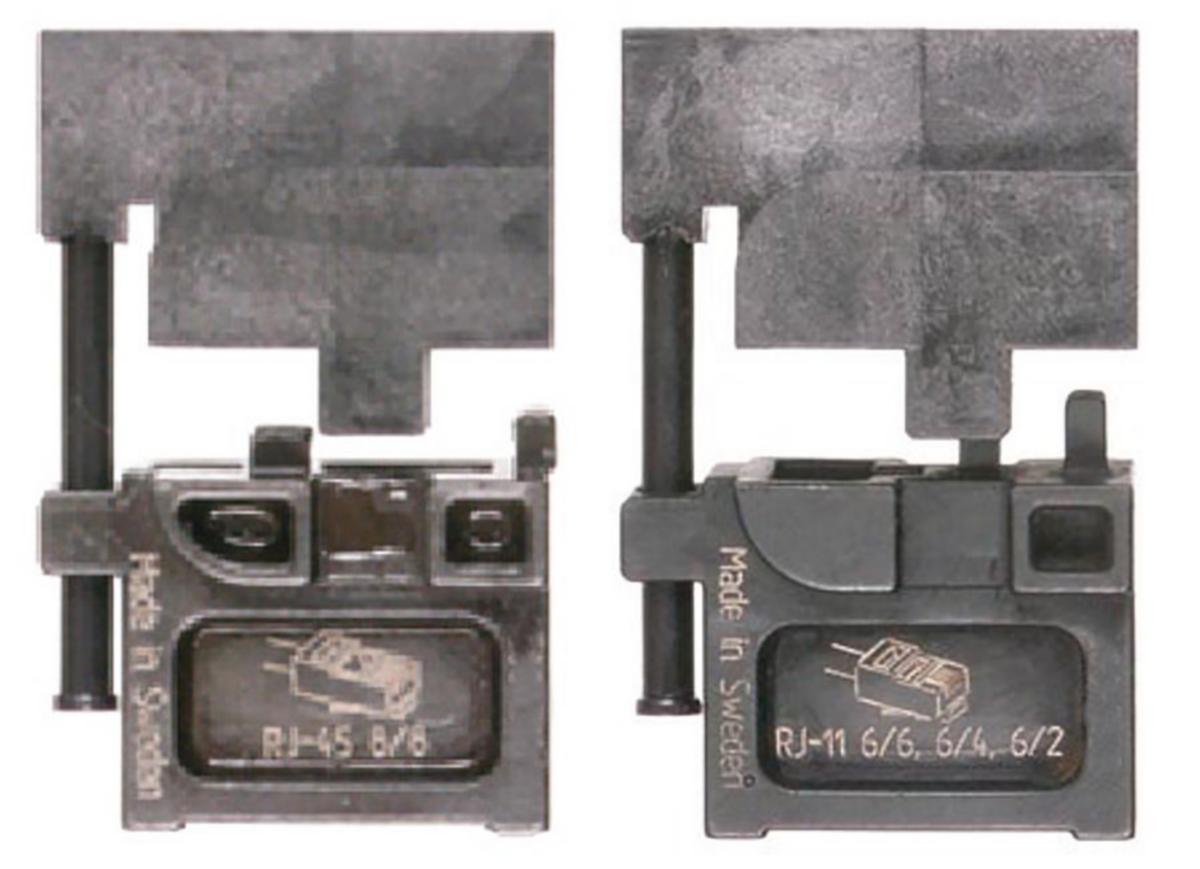 Alla backar har enkel och snabb insättning i tångramen. Backarna hålls ihop parvis och levereras i en kassett som kan dockas till andra kassetter. För pressning av modularplug.