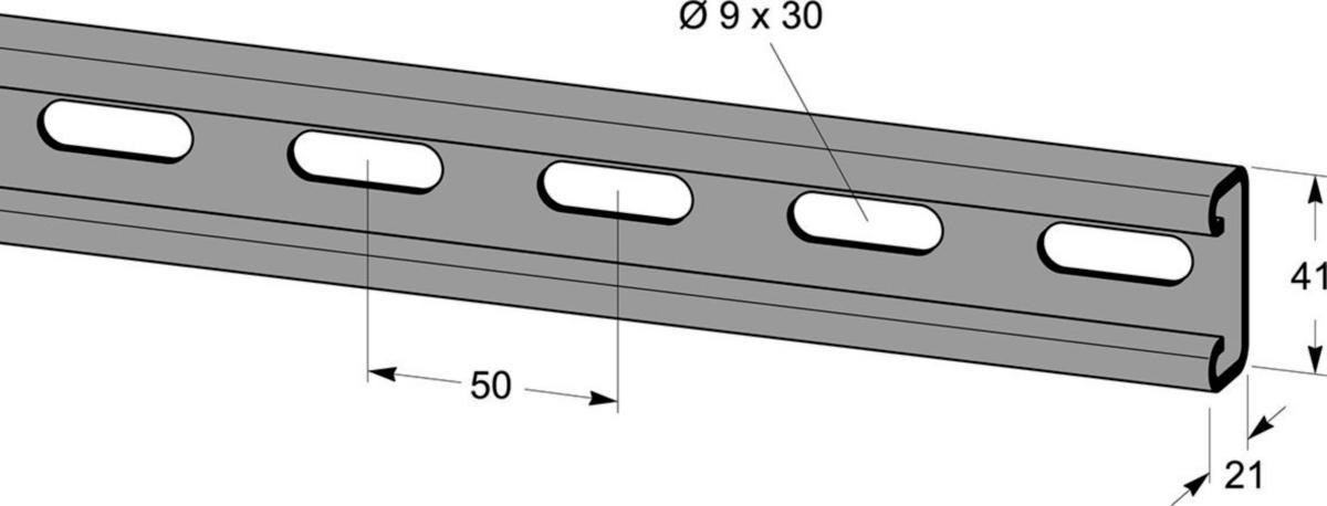 Ankarskena typ MP-V 21x41 mm. Skenan är tillverkad av sendzimirförzinkat stål (20µm) och är användbar i max miljöklass C2.