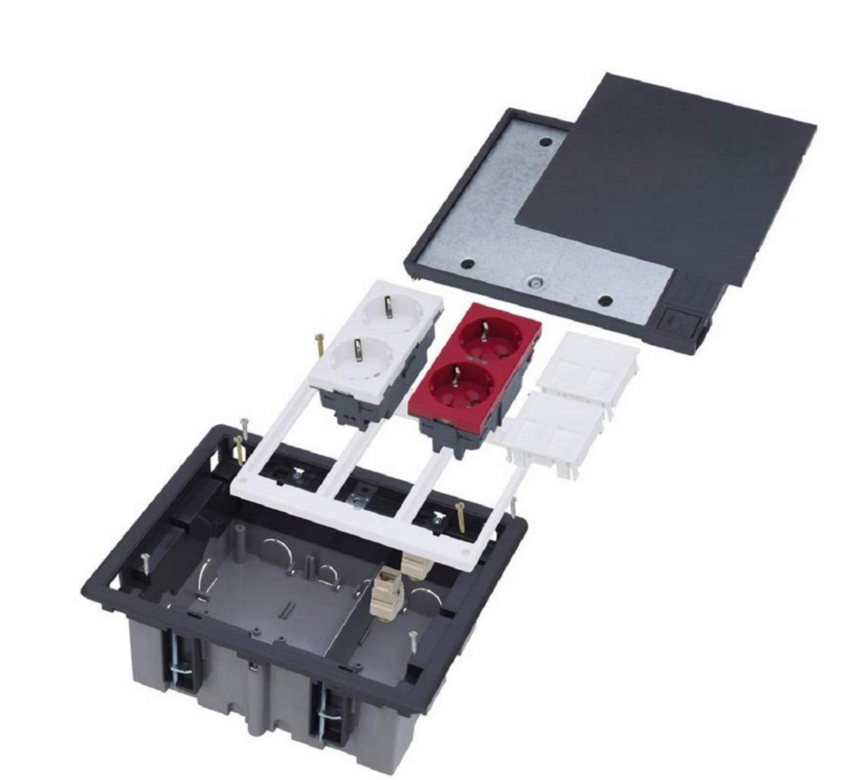 Golvboxar för installationsgolv, hålrumsbjälklag, reglade eller gjutna golv. Boxarna bestyckas med enkla eller dubbla snabbanslutnings uttag och/eller data och mediauttag samt automatsäkring och jordfelsbrytare. Justerbart djup 70-100mm. För att kunna stänga locket med vinklade stickproppar anslutna krävs 75mm
