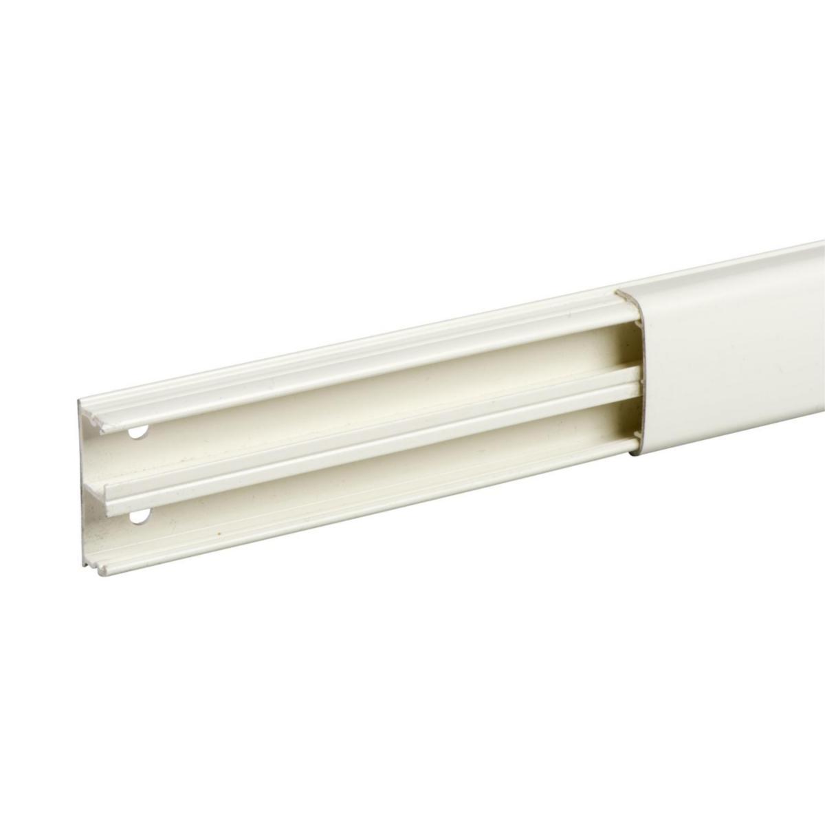 Minikanal OptiLine för stark- och svagströmsledningar, hålslagen underdel. Godkänd för enkelisolerad kabel om man använder skruv TFT-IS, E1534909, som har en isolerande krage. Demontering kräver verktyg. Tillverkad av bly- och kadmiumfri PVC RAL9003