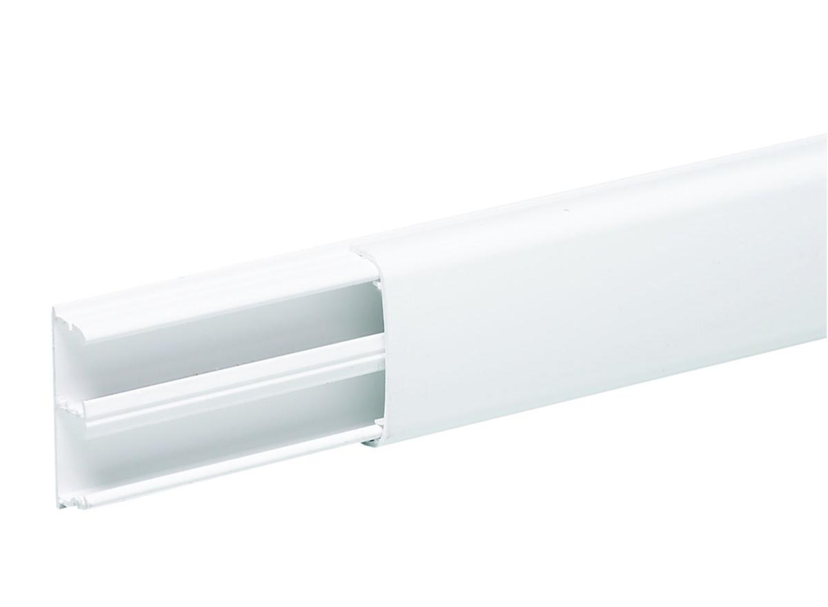Minikanal OptiLine för stark- och svagströmsledningar, hålslagen underdel. Plastversion godkänd för enkelisolerad kabel. Använd gärna skruv E1534909, som har en isolerande krage. Tejpmontage endast för svagström. Demontering kräver verktyg. Finns i bly- och kadmiumfri PVC, halogenfri plast och aluminium