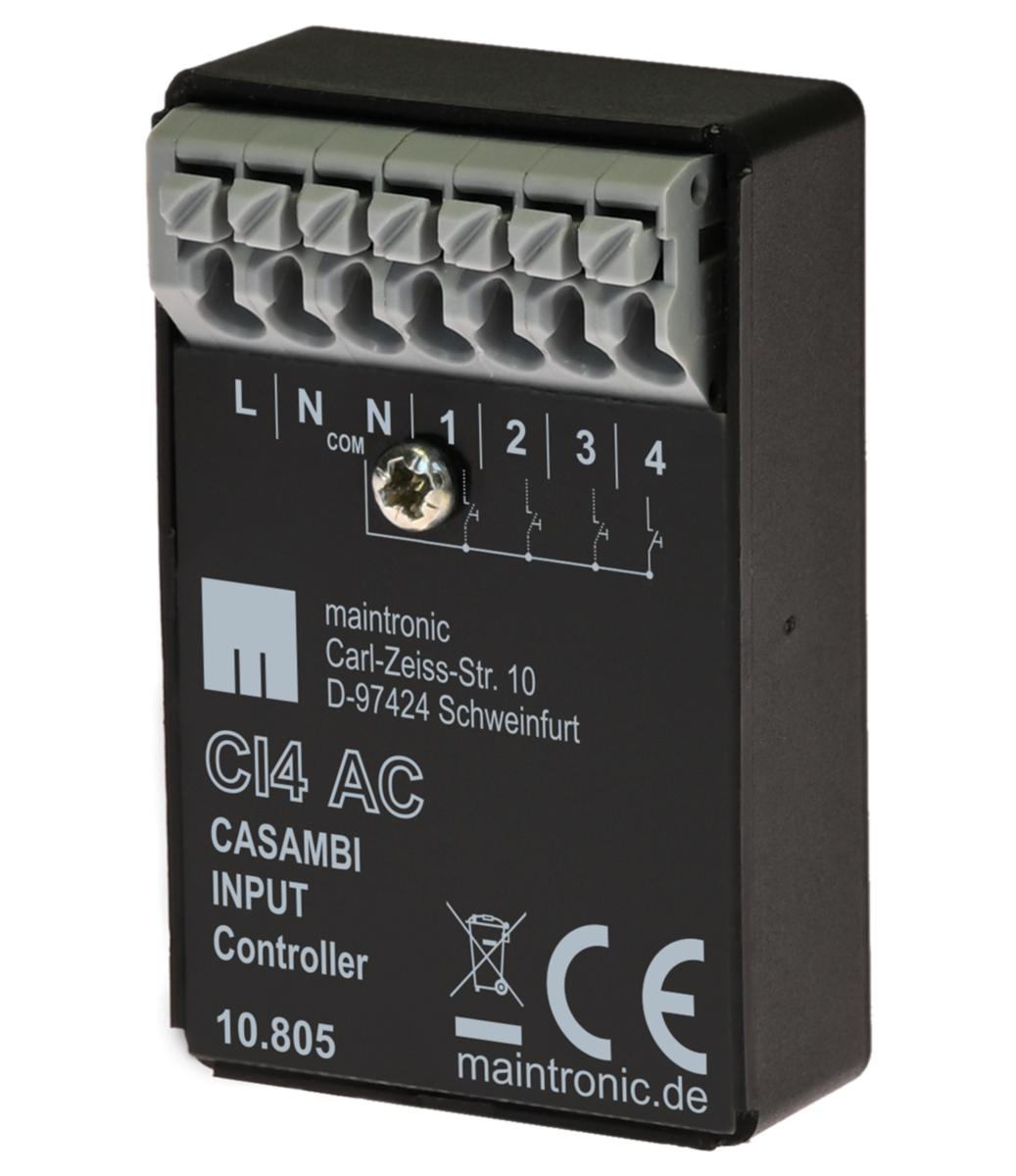 Casambi-kontroller med 4 tryckknappsingångar lämpliga för alla nätspännings godkända tryckknappar från de välkända tryckknapps tillverkare. Enheten drivs med nätspänning, potentialen för tryckknappsingångarna är också nätspänning.