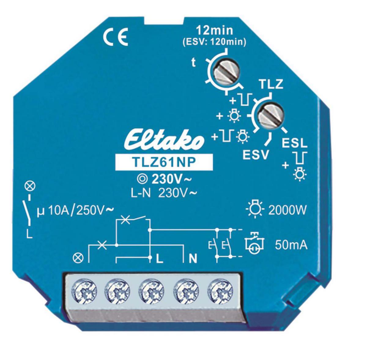 Trappautomat 1 ej potentialfri NO-kontakt. Lämplig för glödlampslast upp till 2000W, lågenergilampor (ESL) och 230 V-LED-lampor upp till 200W. Frånslagningsvarning och konstant-ljusfunktioner, styrbar via tryckknappar. "Standby" förbrukning endast 0,7 watt. Med optimering för lågenergilampor.