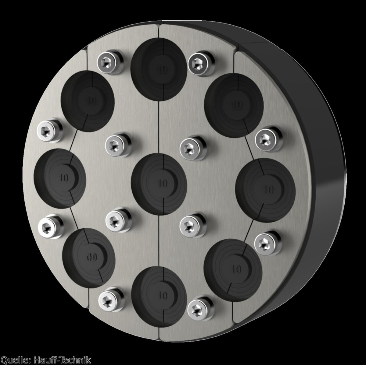 Delat utförande för tätning av nyinstallationer eller redan dragna kablar. Gas- och vattentät. Används i vattentät betong exponeringsklass 1 och 2. Levereras med tomma öppningar försedda med blindpluggar. Kan eftermonteras på redan förlagda kablar. Tätningsgummi av EPDM-gummi med en tjocklek på 40 mm. Pressplattor, skruvar, muttrar och pressplattor av rostfritt stål V2A/AISI 304L.