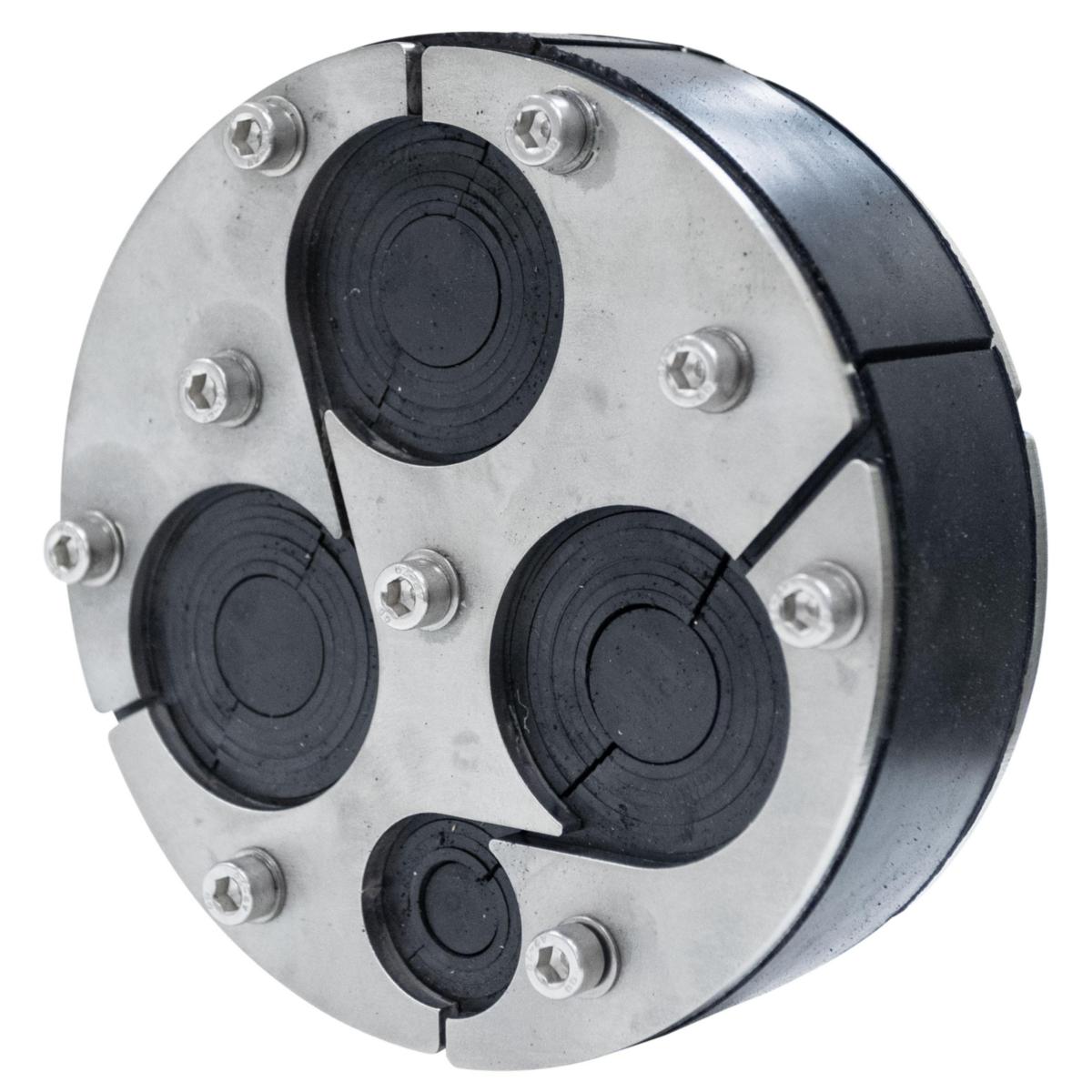 Delat utförande för tätning av nyinstallationer eller redan dragna kablar 20-45 mm och jordningskabel 10-25 mm. Gas- och vattentät. Används i vattentät betong exponeringsklass 1 och 2. Levereras med blindpluggar. Med segmenteringsteknik. Tätningsgummi av EPDM-gummi med en tjocklek på 40 mm. Pressplattor, skruvar och muttrar av rostfritt stål V2A/AISI 304L.