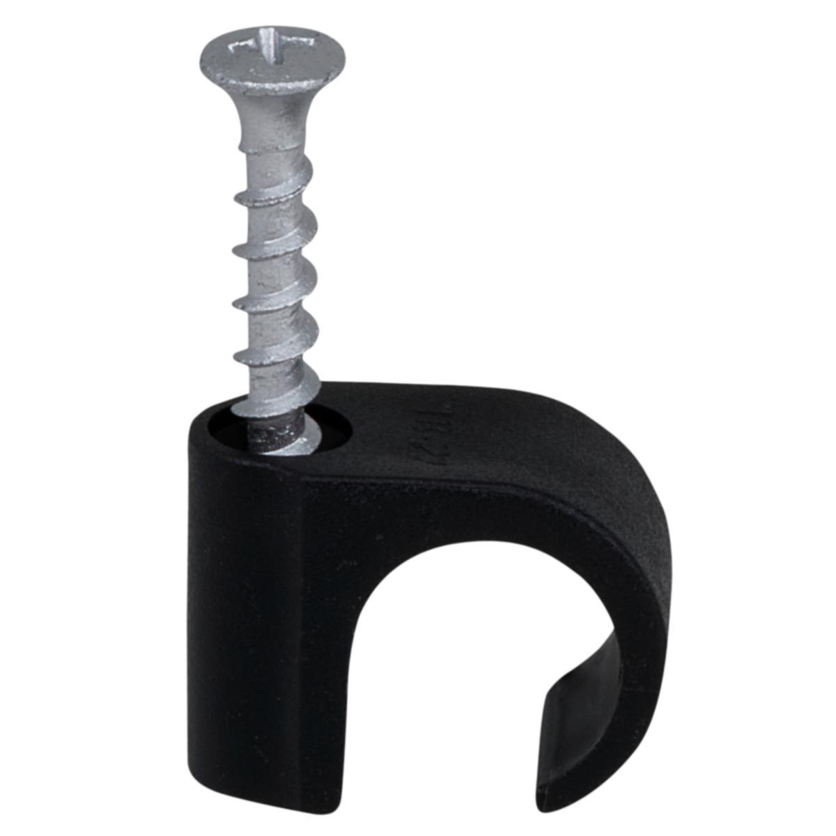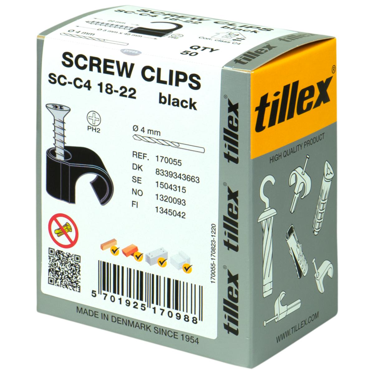 Tillex skruvclips är slagfast elastisk Polypropen som är halogenfri och UV-beständig i hög kvalité från fabriken i Danmark. För runda kablar 7-10mm i färgen svart. Kraftig skruv 5x33mm vilket gör den lämplig för montage direkt i dubbelgips – om skruven överdras passar gul plugg i det hål som uppstått. I betong och tegel fästs skruven direkt i 4mm hål utan plugg. Försedd med Philips krysspår PH2 (Finns även med Torx T20). Korrosivitetsklass C4 vilket ger ett högt skydd utomhus.