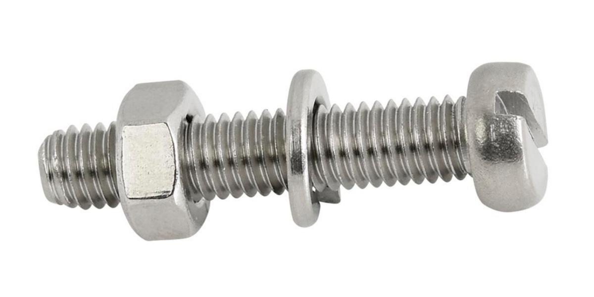 Skruv med fjäderbricka och mutter i syrafast kvalitet A4. OBS! Fjäderbrickan skall alltid användas för potentialanslutningar.