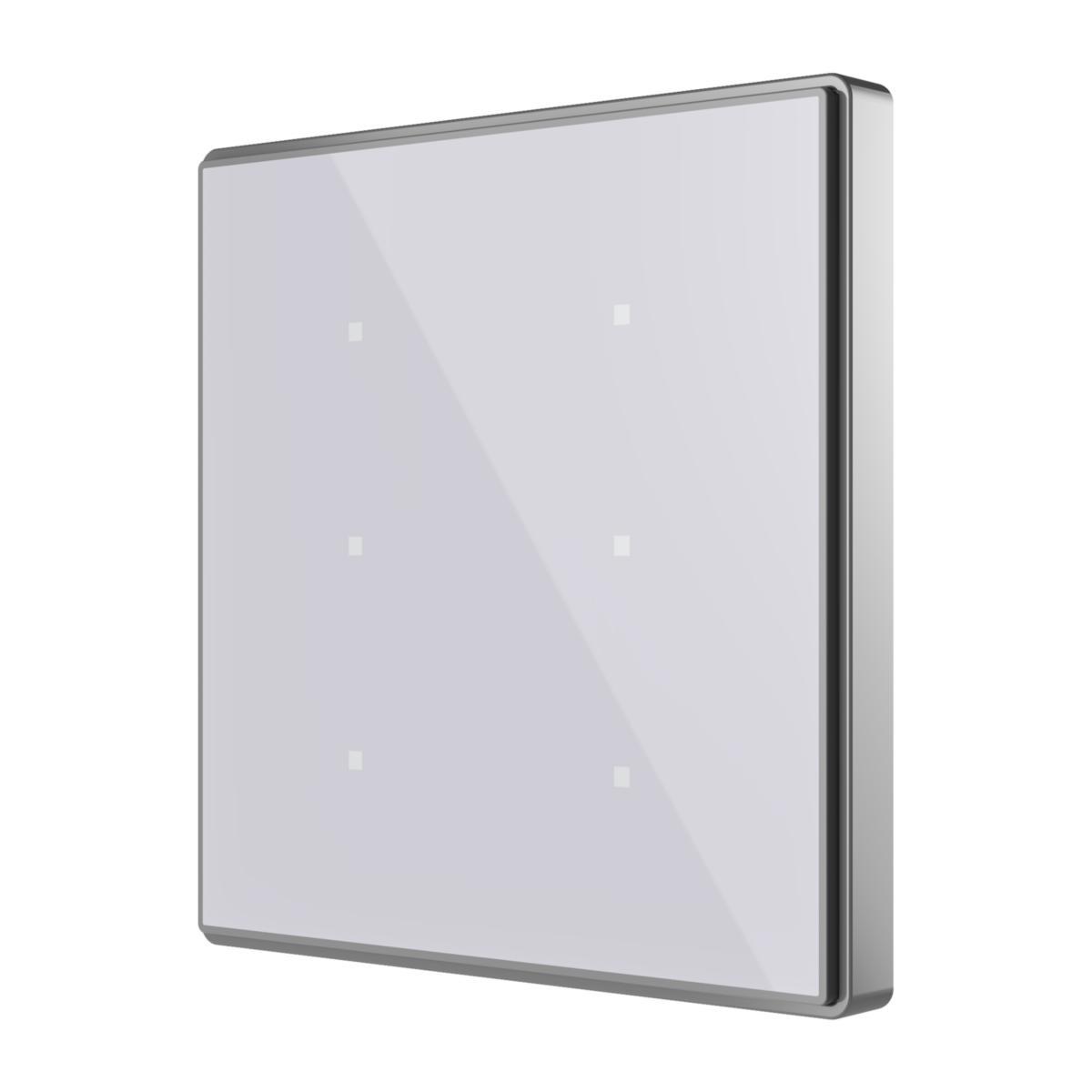 Bakgrundsfärgen är tryckt på höghållfast härdat glas, omgivet av en ram av polykarbonat. Med Square TMD kan du välja olika funktioner för varje knapp och inkluderar även termostatfunktion, intern temperaturgivare och två analoga/digitala ingångar. Tillbehör: extern temperaturgivare och rörelsedetektor. Monteras i apparatdosa