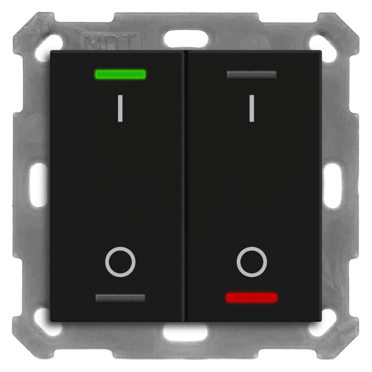 KNX Tryckknapp Lite 55 2-kanaler, RGBW, switch, Svart matt. Version I/O-symbol med 2 tryckknappspar / 4 tryckknappar. Integrerad BCU. Passar 55 mm system/serier: - ELKO, Schneider, SG, Berker, Jung, Merten, GIRA, mm.. Ny multi touch-funktion, skickar upp till 4 värden/DPT på samma eller olika objekt. Innovativ gruppkontroll med lång/extra lång knapptryckning. En- och tvåknappsmanövrering för omkoppling, dimning, jalusier, värden. Ändring av värden/scener med upp till 4 värden. Manövrering med kort/lång knapptryckning och 2 objekt. Fyra RGBW-statuslysdioder. LED-ljusstyrka styrbar via dag/natt eller ljusstyrkaobjekt. Fyra logiska block. Integrerad busskopplingsenhet. 3 års garanti.