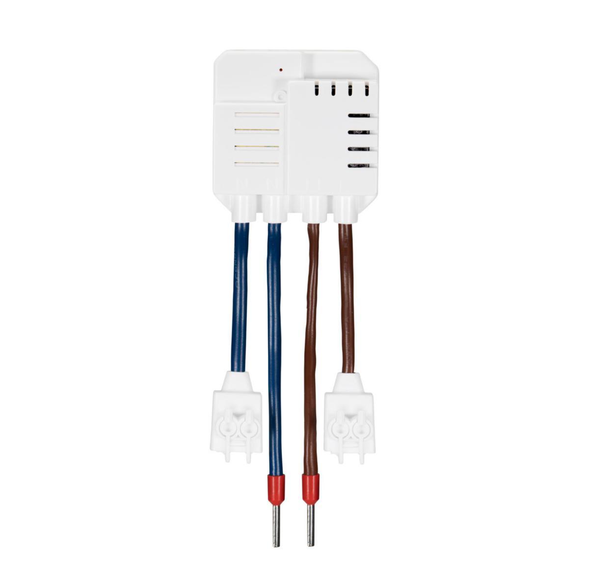 Inbyggnadsmottagare med relä, 3.500W, för fast installation bakom vägguttag som möjliggör att vägguttaget kan styras trådlöst. Mottagaren behöver både fas och nolla. Smart Mode* kompatibel.