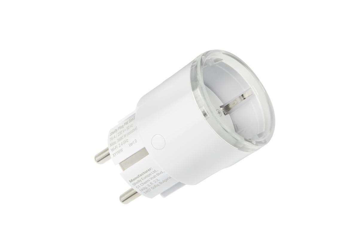 Shelly Plug PM ansluts direkt i ett vanligt vägguttag och ger kontinuerlig, intelligent energimätning. Den integrerade LED-ringen visar aktuell förbrukning i grönt, gult och rött. LED-ljuset kan stängas av helt eller användas som nattbelysning.