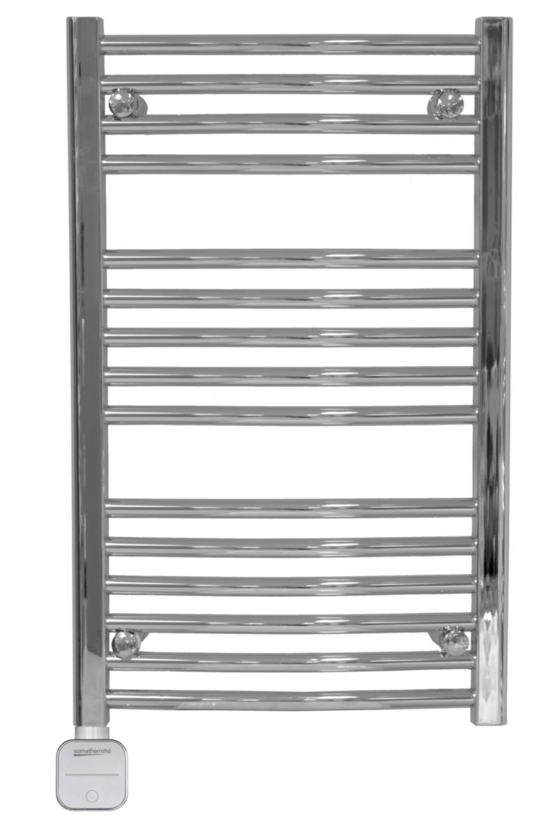 Handdukstork med välvda rör som kommer med vår nya styrning Nex som kan kontrolleras via knappar eller app. Två program via knappval: Turbo timer eller Start-stop timer: 1, 2, 3 eller 4 timmar. Effektreglering i fyra steg mellan 30-60°. Via appen ges även möjlighet att ställa in veckoscheman. IP44, CE