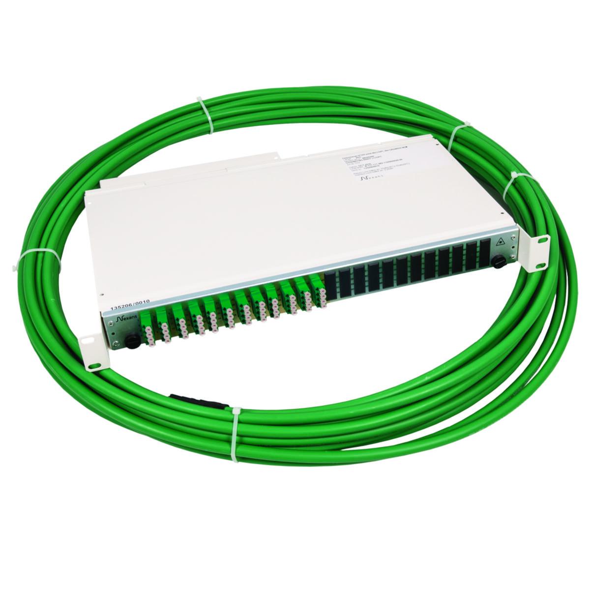 ODF-enhet 19" levereras prefabricerad med kontakttyp LC/APC och kabeltyp GAHSQ. Boxen är komplett med panelplatta, mellanstycken, kontakter, fästvinklar för 19 tum och kabelinfästning.