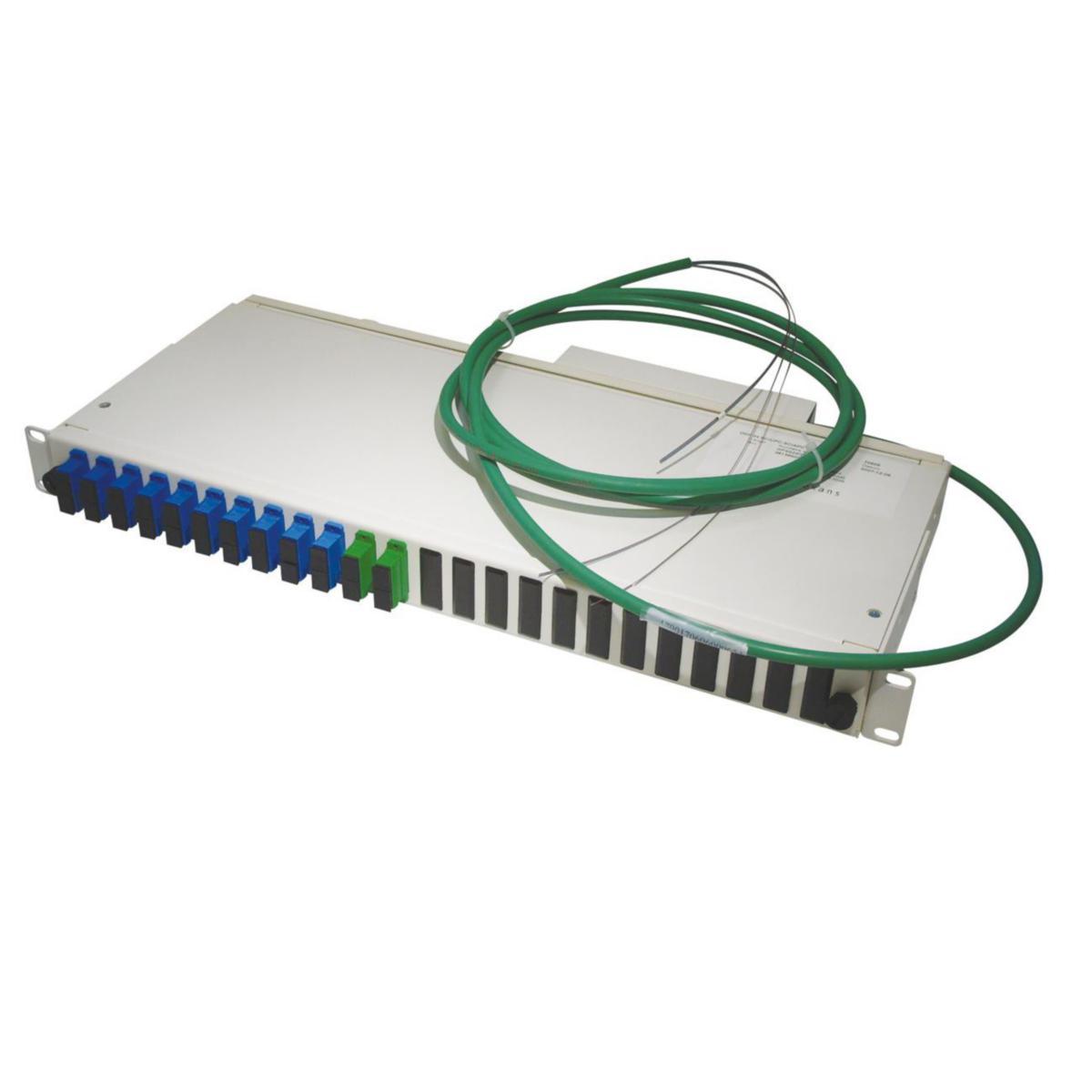 Förkontakterad fiberoptisk korskopplingsbox av typ KB201 G652D korskopplingsboxen levereras förkontakterad med 12 eller 24 fibrer med kontakttyp och prestanda SC/UPC eller SC/APC. Boxen levereras komplett med panelplatta, mellanstycken, kontakter, fästvinklar för 19 tum, ETSI och kabelinfästning samt 3 meter av kabeltypen GAQDBU.