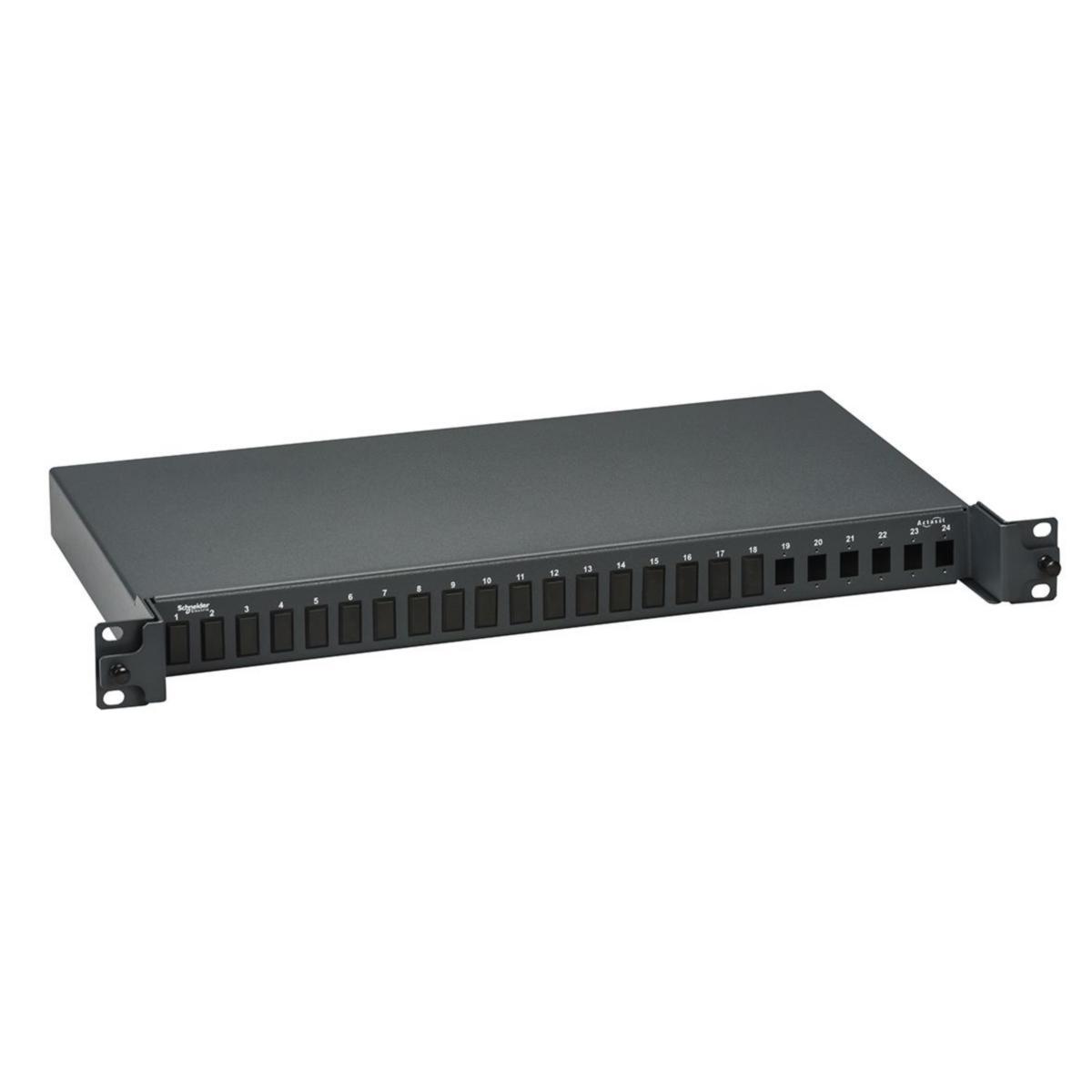 Obestyckad 19"s svart fiberpanel för 24st LC duplexadaptrar med tydlig märkning. Panelen har slidingfunktion och fäste för svetskassetter. 4 kabelingångar varav tre är tätade och en PG9 kabelförskruvning medföljer. Till panelen följer 18 dammluckor, korgmuttrar och med tillhörande skruv.