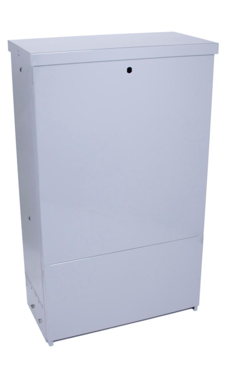 Ett tomt markskåp med montageplatta i ryggen ämnat för optoskarvning. Skåpet levereras med sockel som dras ut, fixeras i skåpet och monteras i marken. För maximal marktätning så bifogas markisolering. Tätningen runt kabel bör kompletteras med tätningsmassa/silikon.