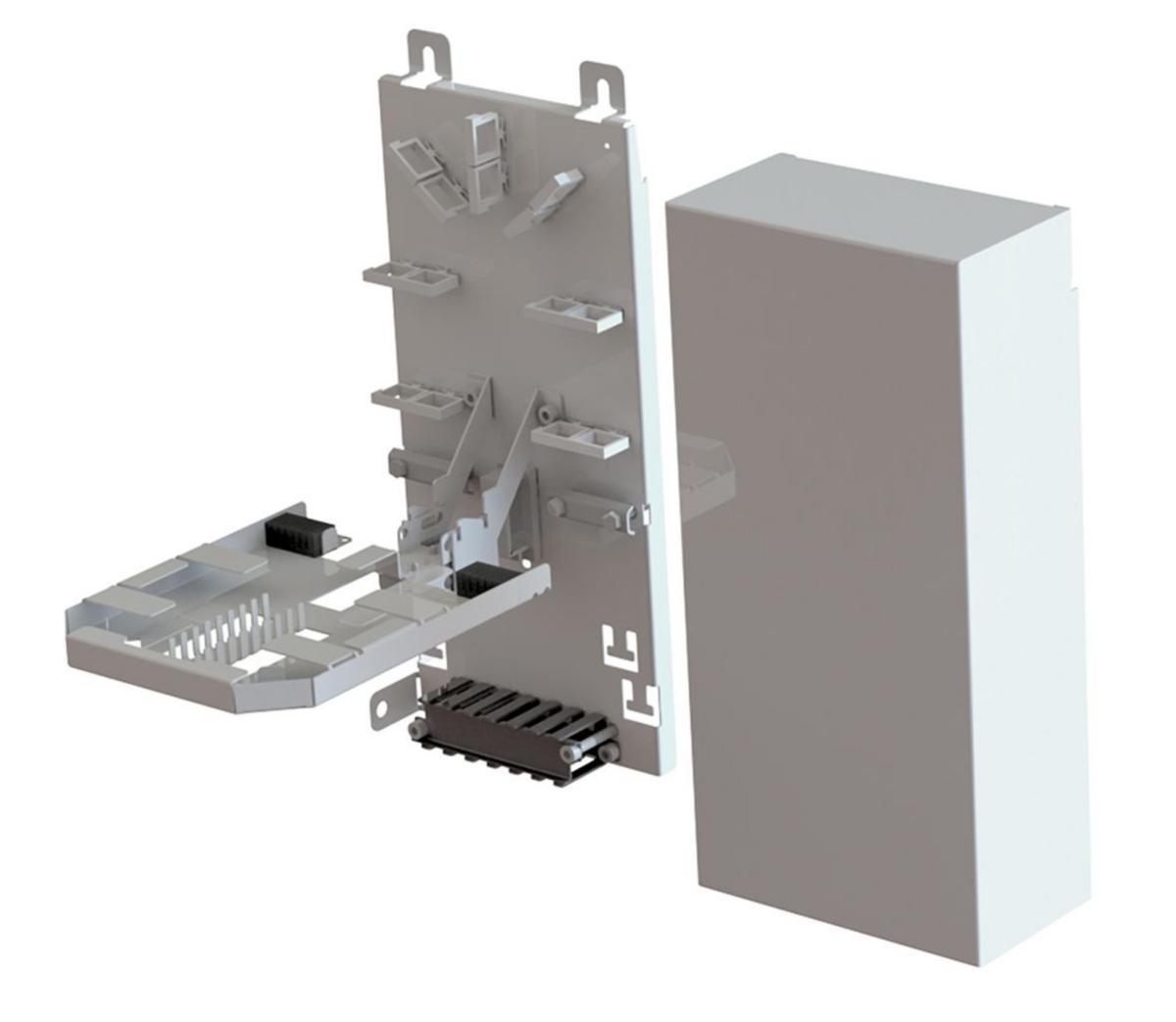 Skarvskåp T2/2B 7/5 mm är ett väggmonterat skåp för skarvning av fiberoptiska kablar och blåsfiber system. Skarvskåp T2/2B 7/5 mm ligger i framkant vad gäller behovet av nya flexibla lösningar för FTTH-nät. Skarvskåp T2/2B 7/5 mm tillgodoser behovet för en kompakt och användarvänlig distributions box inom FTTx. Kablar och mikrodukter tas in i underkant av skåpet, dubbelhål i botten ger möjlighet att lägga fiber i obruten slinga. Skarvskåp T2/2B 7/5 mm är utrustat med ett låsbart lock och tätning. Utgående kabelgenomföring rymmer upp till 24 tuber eller mikrokablar (max Ø 5,5 mm). Skarvkassetten rymmer 24 singelfiber hylsor. Fästplåt används när man önskar ta ned eller ut (ur t.ex. ett markskåp) en T2/2B 7/5 mm. Med nyckelhålsfästen på utsidan blir detta en enkel operation.