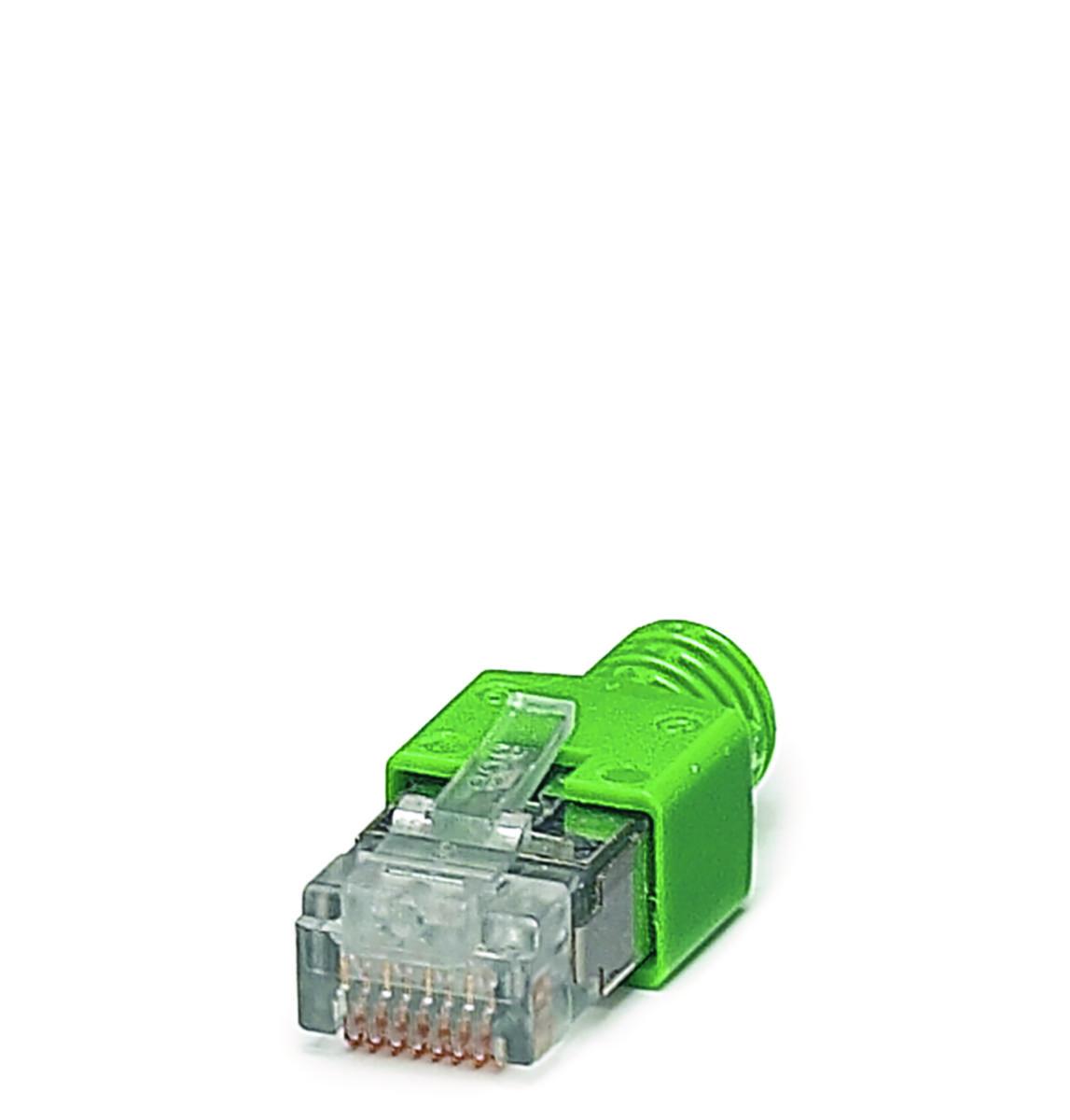 RJ45-hane, skärmad, med böjskydd, 2 stycken, grön för korsad kabel, för konfektionering på platsen. Det rekommenderas att man använder kontaktsatsen med grönt böjskydd för korsade förbindelser.