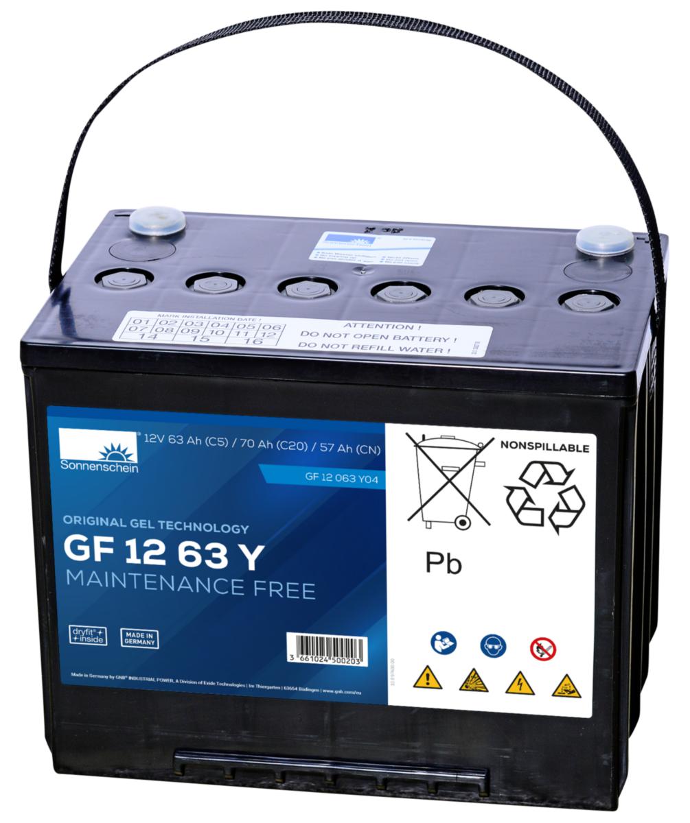 Sonnenschein GF-Y-serien är särskilt lämplig för fritids- och mobilitetsmarknaden, inklusive elektriska båtar, golfbilar, rullstolar och skotrar. VRLA-teknologi (ventilreglerad blybatteriteknik), elektrolyten är bunden i en gel. Underhållsfria (ingen påfyllning) under hela livslängden tack vare Sonnenschein dryfit®-teknologi. 450 cykler enligt IEC 60254-1. Mycket robust konstruktion.