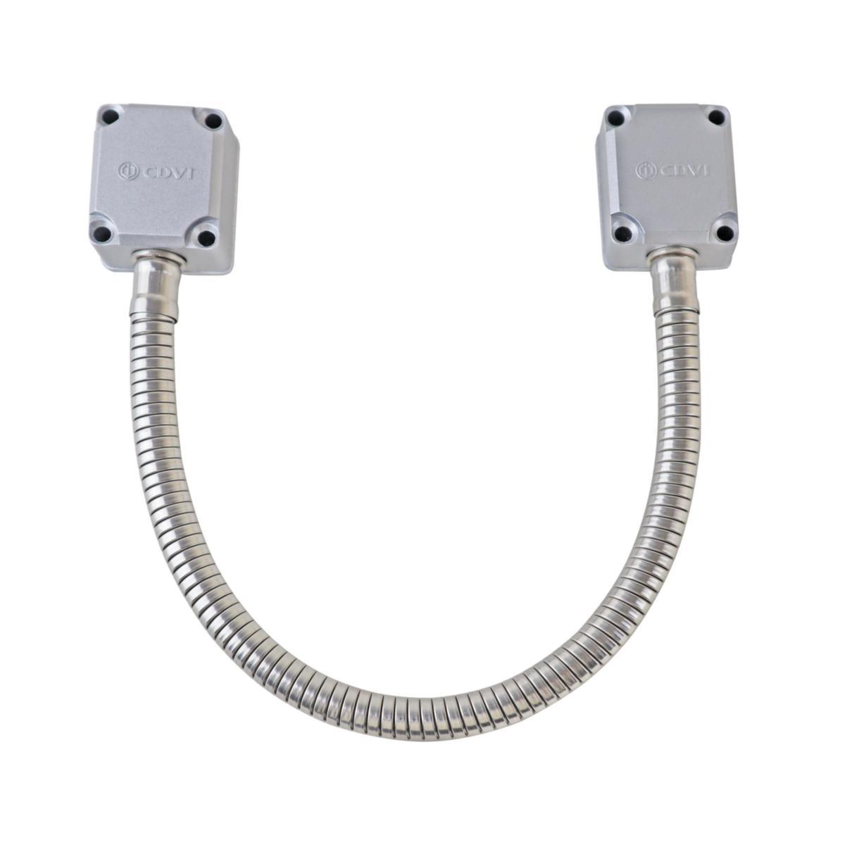 Kraftig karmöverföring i rostfritt stål som ersätter infällda modeller men uppfyller ändå kraven på vandalsäker överföring. Passar utmärkt till skolor, idrottshallar och i andra offentliga lokaler. Spiralkabeln är specialtillverkad för ökat skydd och behöver ingen vajer som förstärkning. Anslutningen till ändstyckena är ledade för att försvåra vandalism. Förankring i vägg och dörrblad är viktig. Längd: 450 mm, innerdiameter 9 mm. Levereras komplett med skruv.